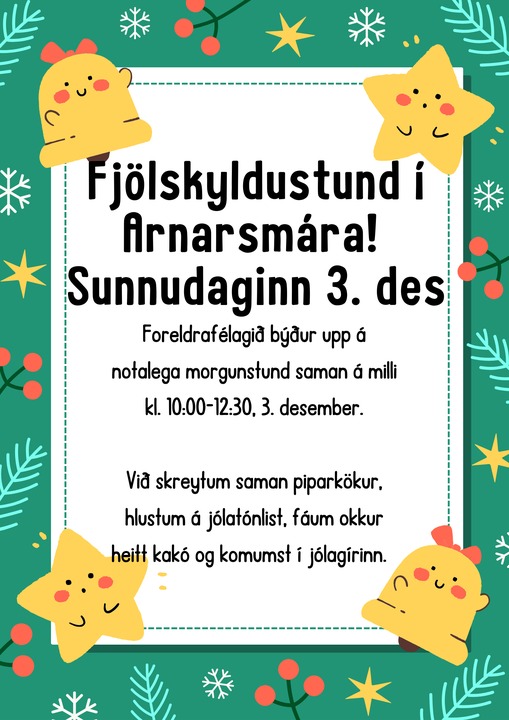 Sunnudaginn 3.desember ætlar foreldrafélagið að bjóða uppá fjölskyldustund í Arnarsmára klukkan 10:00-12:30. Þar verða skreyttar piparkökur, hlustað á jólalög, drukkið kakó og allir komast í jólagírinn.
