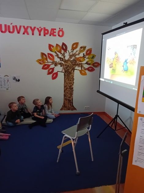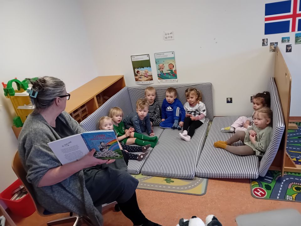 Þennan sama dag var einnig Stóri læsisdagurinn hjá okkur. Um morguninn var börnunum skipt upp í hópa og fóru þau á milli stöðva og gerðu ýmis verkefni tengd læsi.