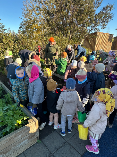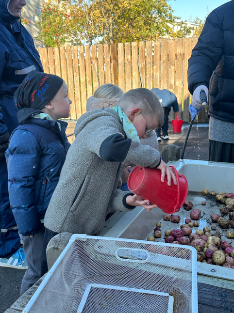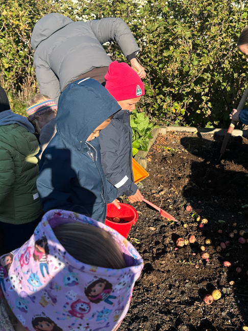Í gær, 18.september, var uppskeruhátíð hjá okkur í Arnarsmára. Hátíðin hófst á því að allir gengu í skrúðgöngu hring í garðinum þar sem var sungið og slegið á trommur. Síðan tókum við upp kartöflurnar sem við erum búin að vera að rækta í görðunum okkar. Kartöflurnar voru síðan skolaðar og settar í geymslu. Aneta ætlar síðan að elda kartöflurnar á mánudaginn svo við getum borðað þær með fiskinum.