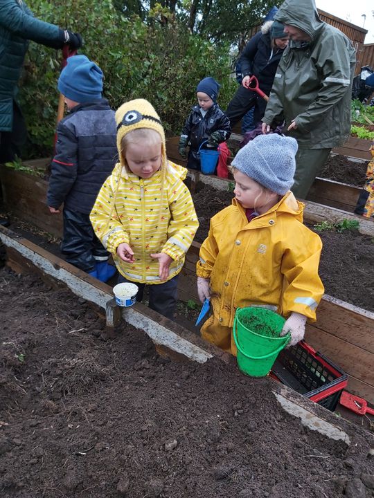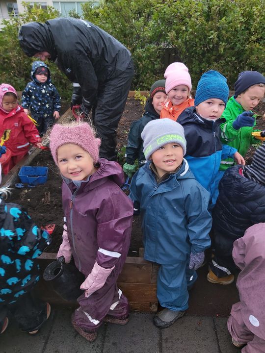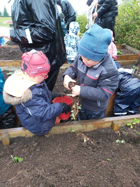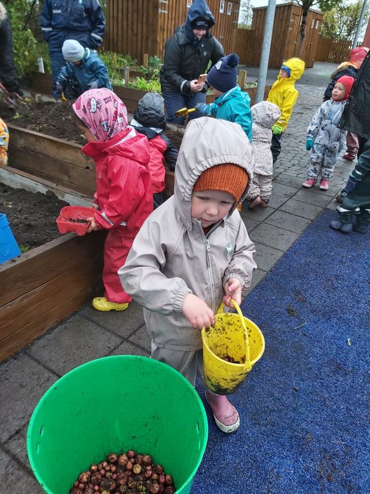 Nú í vikunni á degi íslenkrar náttúru var uppskeruhátið í Arnarsmára. Farið var fylgtu liði í skrúðgöngu um lóð skólans og barðar trumbur (fötur með skóflum). Eftir það var hafist handa við að taka upp kartöflur, uppskeran var frekar rýr en kartöflurnar góðar með soðna fiskinum. Gulræturnar voru gómsætar en búið var að gæða sér á salatinu áður.
