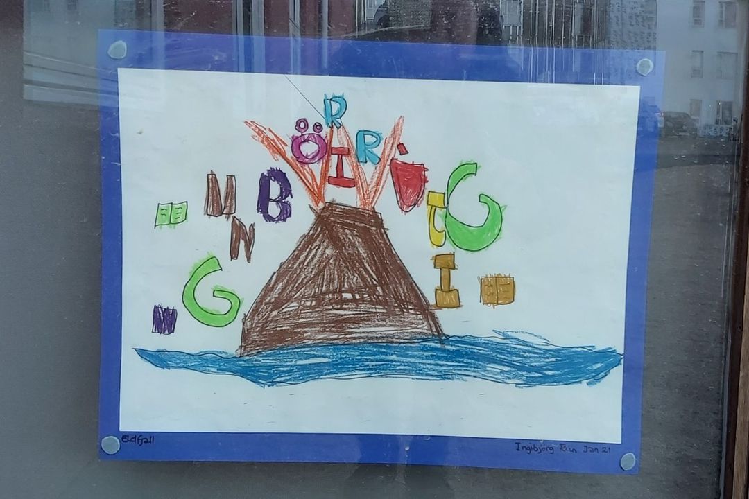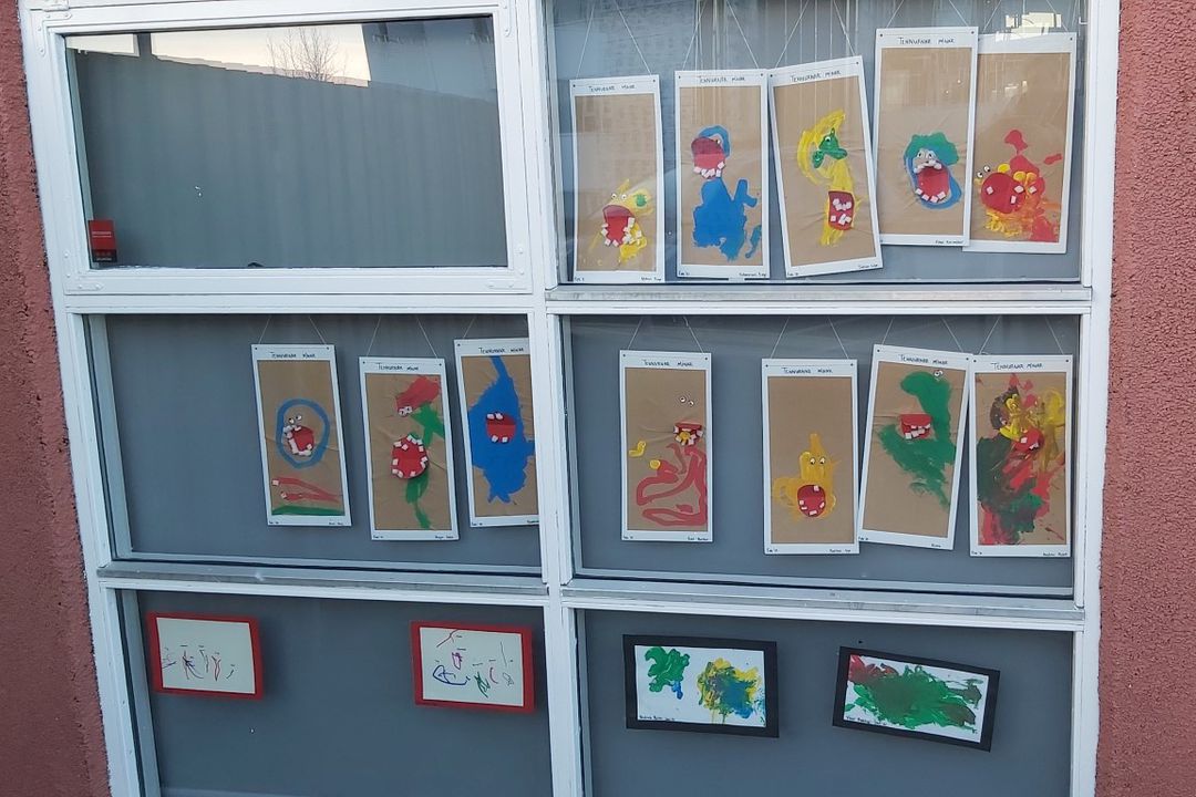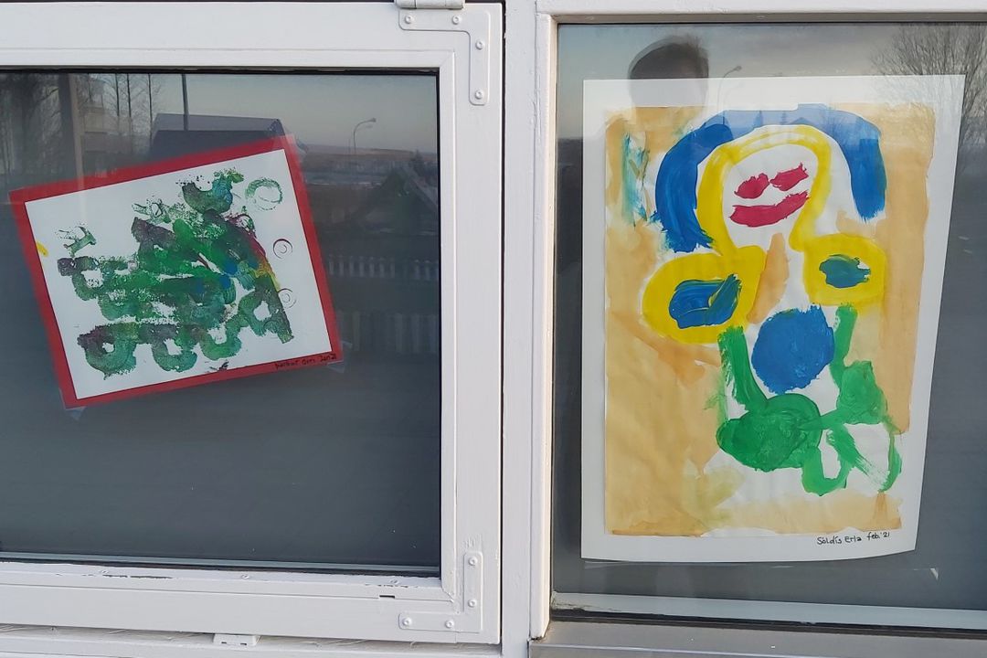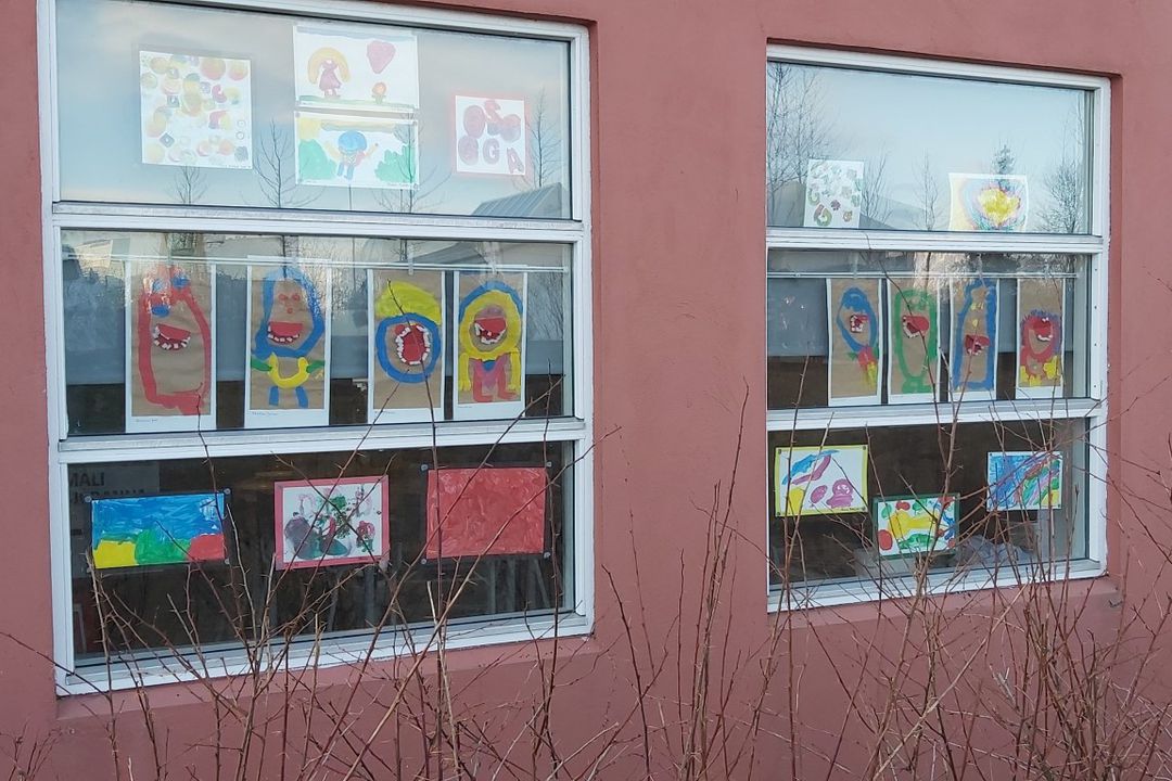 En til að gera starfið sýnilegra hafa verk barnanna verið sett út í gluggana til að gleðja þá sem leið eiga við skólann.